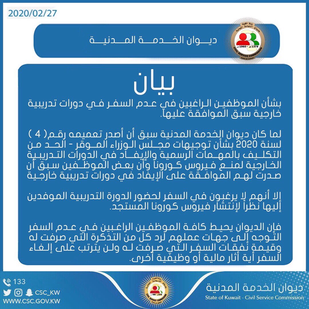 ديوان الخدمة المدنية على تويتر ديوان الخدمة المدنية بيان بشأن الموظفين الراغبين فـي عدم السفر فـي دورات تدريـبية خـارجـية سبـق الموافقة عليها